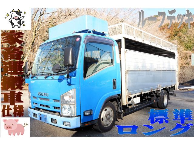エルフ標準ロングのルーフデッキ付アルミブロック平ボディ家畜運搬車になります。
