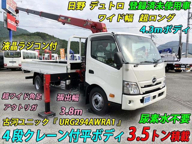 ★管理番号:L-22603 日野 デュトロ 4段クレーン付 平ボディ 3.5トン積載 4.3mボディ 古河ユニック 液晶ラジコン 超ワイド角足 ワイド 超ロング 登録済未使用車 尿素水不要