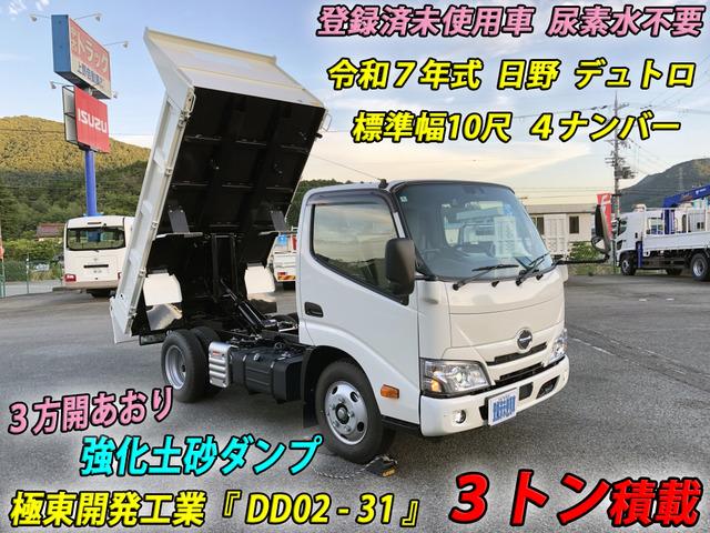 ★管理番号:L-50621 日野 デュトロ 3トン 土砂ダンプ 強化ダンプ 極東開発工業 3方開あおり 角底ボディ 4ナンバー 全低床 標準幅 10尺 登録済未使用車 尿素水不要!